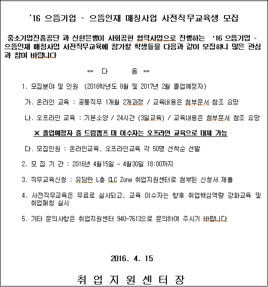 공지사항 전체공지 일반공지 학사공지 장학공지 진로취업공지 행사안내 대외활동 등록·납부 채용공지 서경 TODAY 서경 TODAY FAQ 전체 FAQ 교무학적 FAQ 장학 FAQ IT FAQ 자료실 전체 자료실 교무학적 자료실 장학 자료실 IT 자료실 개인정보공지 전체 개인정보공지 개인정보보호공지 개인정보위수탁업체공지 개인정보제공내역공지 ‘16 으뜸기업 – 으뜸인재 매칭사업 사전직무교육생 모집 작성자서경혁신원 등록일2016-04-15 조회수60474 첨부파일 390e7a87-c1e5-4fb1-af60-1b3c5514c63c.png 참가 신청서.hwp 온라인 및 오프라인 교육내용.hwp 목록