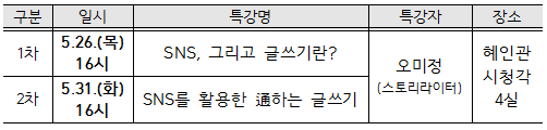 마. 기타사항 : 운영 중인 개인 SNS가 있는 경우, 특강자의 구체적인 조언을 얻고자 하는 참가자는 신청서에 주소를 기재해 주시기 바랍니다.