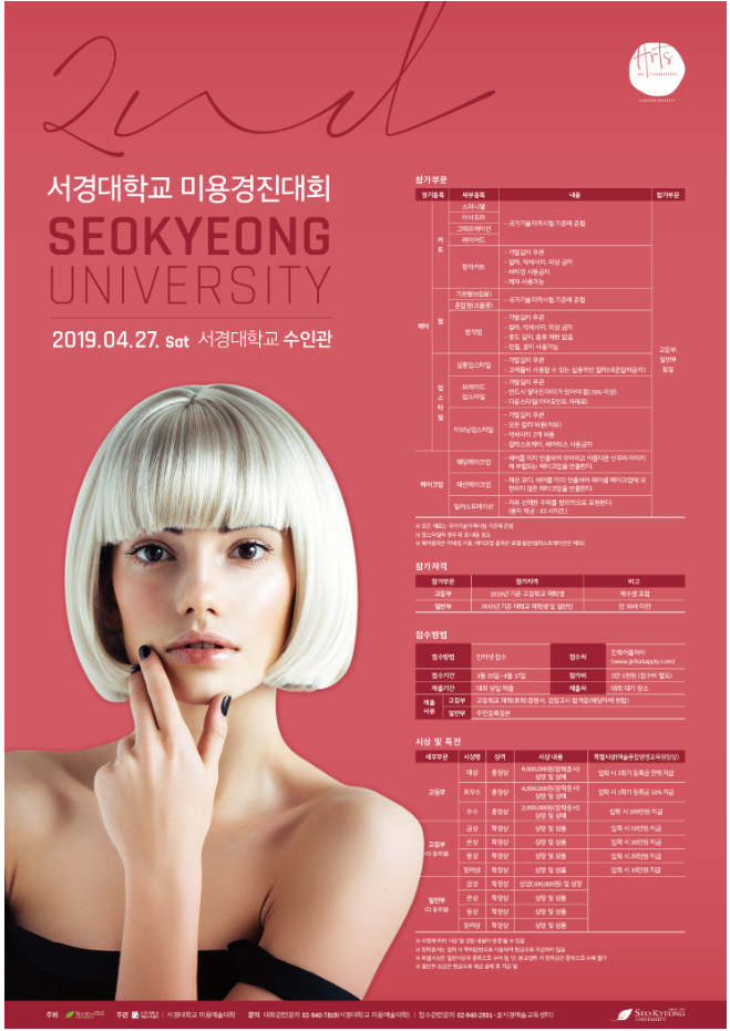 공지사항 전체공지 일반공지 학사공지 장학공지 진로취업공지 행사안내 대외활동 등록·납부 채용공지 서경 TODAY 서경 TODAY FAQ 전체 FAQ 일반 FAQ 교무학적 FAQ 장학 FAQ IT FAQ 자료실 전체 자료실 일반 자료실 교무학적 자료실 장학 자료실 IT 자료실 개인정보공지 전체 개인정보공지 개인정보보호공지 개인정보위수탁업체공지 개인정보제공내역공지 2019 제2회 서경대학교 전국미용경진대회 대기시간표 및 지원자 유의사항 안내 작성자서경예술교육센터 등록일2019-04-22 조회수14038 2019 제 2회 서경대학교 전국미용경진대회 일정 및 유의사항 안내는 첨부파일을 참고하시기 바랍니다. * 대회당일 무료주차 입니다. ☎ 문의전화 접수관련 02-940-2931~2(서경예술교육센터) 진행관련 02-940-7815(서경대학교 미용예술대학) 첨부파일 7ceaca7e-f908-4330-9dea-a52625bb9b0b.png 2019_제2회 서경대학교 전국미용경진대회일정.pdf 목록