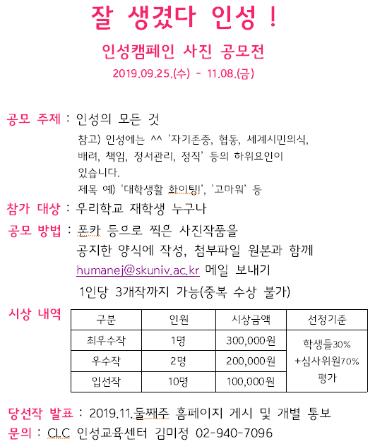 공지사항 전체공지 일반공지 학사공지 장학공지 진로취업공지 행사안내 대외활동 등록·납부 채용공지 서경 TODAY 서경 TODAY FAQ 전체 FAQ 일반 FAQ 교무학적 FAQ 장학 FAQ IT FAQ 자료실 전체 자료실 일반 자료실 교무학적 자료실 장학 자료실 IT 자료실 개인정보공지 전체 개인정보공지 개인정보보호공지 개인정보위수탁업체공지 개인정보제공내역공지 [대학혁신]인성교육센터-인성캠페인 사진공모전 '잘 생겼다 인성!'모집 작성자인성교육센터 등록일2019-10-01 조회수19940 [대학혁신]인성교육센터–인성 캠페인 사진 공모전 개최 첨부파일 95ea0593-12e7-48c4-8de9-7a8c1418f359.png 인성캠페인 사진공모전_신청서.hwp 목록