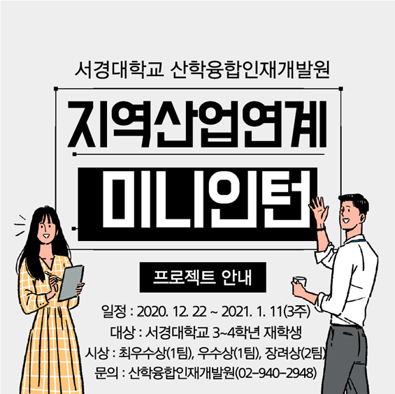 지역산업연계 미니인턴 프로젝트의 학생을 다음과 같이 모집하고자 하오니 관심 있는 학생의 많은 지원 바랍니다.