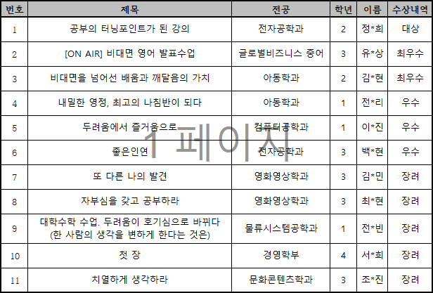교수학습지원센터에서는 2021학년도 Best Lecture Sharing(우수 강의 수필) 공모전을 실시하고 다음과 같이 수상자를 발표합니다. 수상자 학생 모두 축하드립니다.