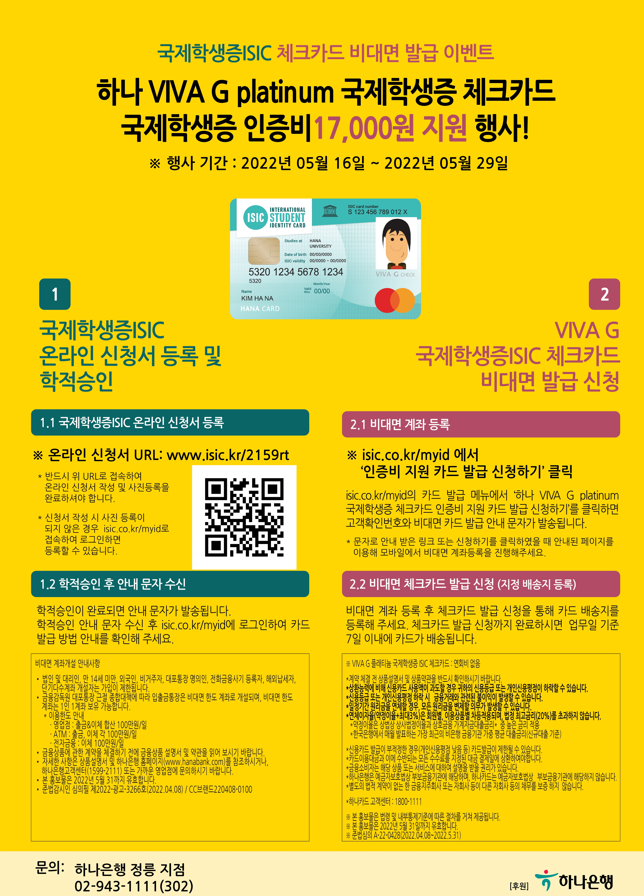 5. 발급비용 : 무료(국제학생증 인증비 17,000원 하나은행 부담)