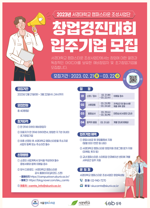 서경대학교 캠퍼스타운조성사업단에서는 창업에 대한 열정과 독창적인 아이디어를 보유한 예비창업자 및 초기 창업기업을 모집하오니 많은 참여 바랍니다.