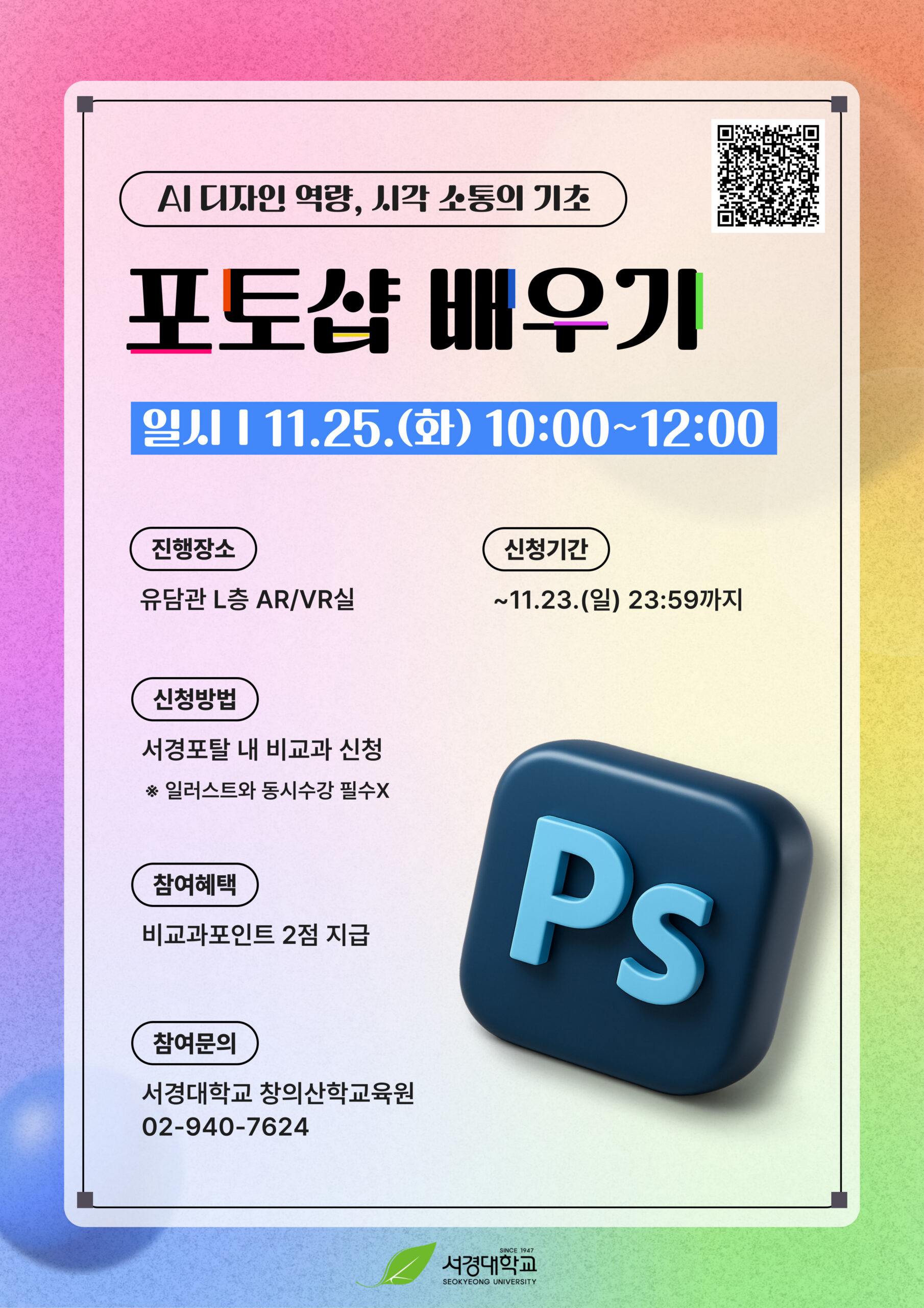 2025학년도 2학기 ‘포토샵 배우기(AI 디자인 역량, 시각 소통의 기초)’ 교육을 아래와 같이 안내하오니 학생들의 많은 관심과 참여 부탁드립니다.