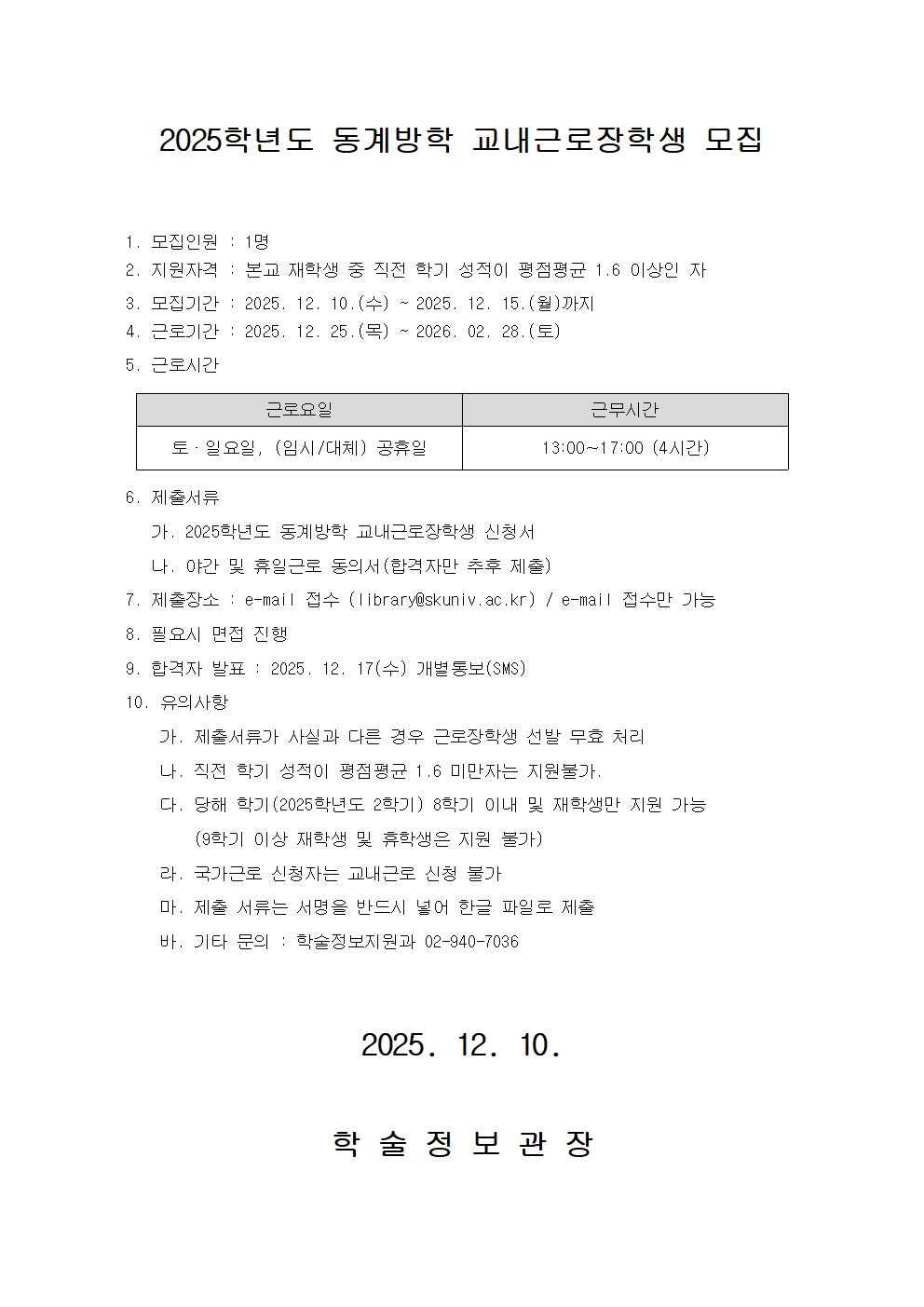 공지사항 전체공지 일반공지 학사공지 FYP공지 장학공지 진로취업공지 행사안내 대외활동 등록·납부 채용공지 서경 TODAY 서경 TODAY FAQ 전체 FAQ 일반 FAQ 교무학적 FAQ 장학 FAQ IT FAQ 자료실 전체 자료실 일반 자료실 교무학적 자료실 장학 자료실 IT 자료실 개인정보공지 전체 개인정보공지 개인정보보호공지 개인정보위수탁업체공지 개인정보제공내역공지 [학술정보관] 2025학년도 동계방학 교내근로장학생 모집 작성자학술정보관 등록일2025-12-10 조회수720 진행완료 2025-12-10 ~ 2025-12-15 첨부파일 2025학년도 동계방학 교내근로장학생 신청서(학술정보관).hwp 목록