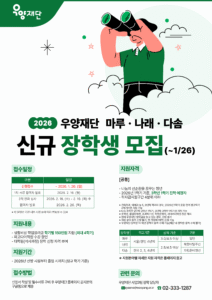 공지사항 전체공지 일반공지 학사공지 FYP공지 장학공지 진로취업공지 행사안내 대외활동 등록·납부 채용공지 서경 TODAY 서경 TODAY FAQ 전체 FAQ 일반 FAQ 교무학적 FAQ 장학 FAQ IT FAQ 자료실 전체 자료실 일반 자료실 교무학적 자료실 장학 자료실 IT 자료실 개인정보공지 전체 개인정보공지 개인정보보호공지 개인정보위수탁업체공지 개인정보제공내역공지 2026년 우양재단 신규 장학생(마루,나래,다솜)모집 안내 작성자장학과 등록일2026-01-07 조회수280 첨부파일 [붙임2-1] 2026년 마루 장학생 신청서.hwp [붙임2-2] 2026년 나래 장학생 신청서.hwp [붙임2-3] 2026년 다솜 장학생 신청서.hwp [붙임2-4] 개인[신용]정보 수집·이용·제공 및 조회 동의서.hwp 목록