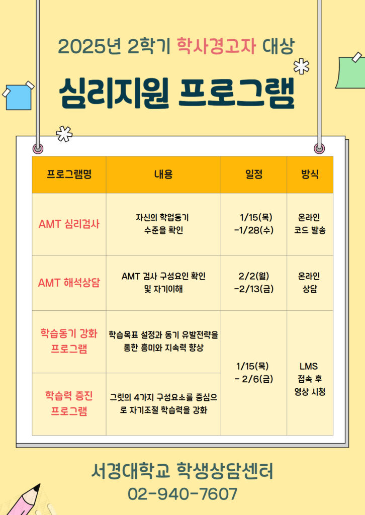 학생상담센터에서는 다음과 같이 2025학년도 2학기 학사경고자 대상으로 심리 지원 프로그램을 운영하고자 합니다. 많은 관심과 참여부탁드립니다.