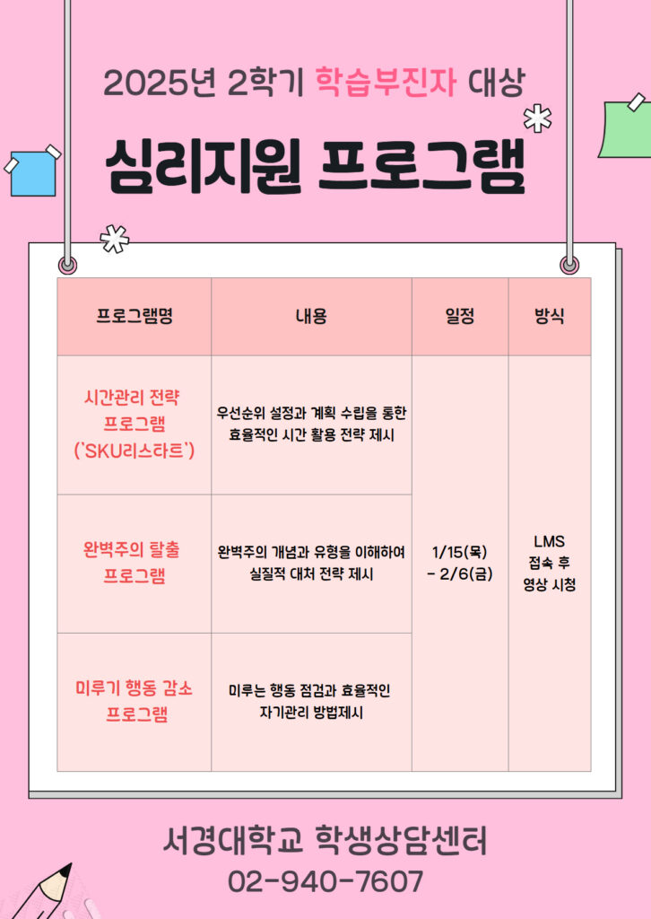 학생상담센터에서는 다음과 같이 2025학년도 2학기 학습부진자 대상으로 심리 지원 프로그램을 운영하고자 합니다많은 관심과 참여부탁드립니다.