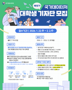 공지사항 전체공지 일반공지 학사공지 FYP공지 장학공지 진로취업공지 행사안내 대외활동 등록·납부 채용공지 서경 TODAY 서경 TODAY FAQ 전체 FAQ 일반 FAQ 교무학적 FAQ 장학 FAQ IT FAQ 자료실 전체 자료실 일반 자료실 교무학적 자료실 장학 자료실 IT 자료실 개인정보공지 전체 개인정보공지 개인정보보호공지 개인정보위수탁업체공지 개인정보제공내역공지 2026년 제18기 국가데이터처 대학생 기자단 모집 안내 작성자학생과 등록일2026-01-28 조회수389 진행완료 2026-01-28 ~ 2026-02-02 국가데이터처는 국민과 국가데이터처의 소통을 원활히 하고 국가데이터처를 알리는 활동을 할 <2026년 제 18기 국가데이터처 대학생 기자단>을 모집합니다. 관심있는 학생은 아래 포스터 참고 바랍니다. 붙임1. 공고 포스터. 붙임2. 지원서docx. 붙임3. 지원서hwpx. 끝. 첨부파일 제18기 국가데이터처 대학생 기자단 모집 공고.png 2026년 제18기 국가데이터처 대학생 기자단 지원서.hwpx 2026년 제18기 국가데이터처 대학생 기자단 지원서.docx 목록
