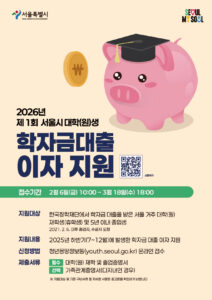 공지사항 전체공지 일반공지 학사공지 FYP공지 장학공지 진로취업공지 행사안내 대외활동 등록·납부 채용공지 서경 TODAY 서경 TODAY FAQ 전체 FAQ 일반 FAQ 교무학적 FAQ 장학 FAQ IT FAQ 자료실 전체 자료실 일반 자료실 교무학적 자료실 장학 자료실 IT 자료실 개인정보공지 전체 개인정보공지 개인정보보호공지 개인정보위수탁업체공지 개인정보제공내역공지 2026년 제1차 서울시 학자금대출이자 지원가업 신청자 홍보 작성자장학과 등록일2026-02-10 조회수66 첨부파일 2026년 제1차 서울시 학자금대출이자 지원 사업 신청자 홍보 요청.pdf 2026년 제1회 대학생 학자금대출 이자지원 공고문 (2).hwpx 목록