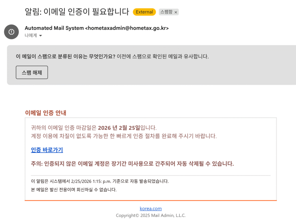 최근 공공기관 및 주요 포털을 사칭하여 “이메일 인증이 필요합니다” 또는 “미인증 시 계정이 삭제됩니다”라는 내용의 피싱 메일이 급증하고 있습니다.