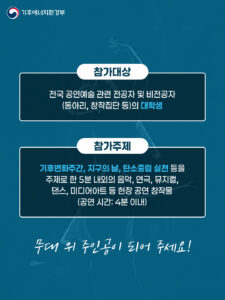 다. 대상: 탄소중립에 관심이 있는 전국 대학생 누구나 *공연예술 관련 전공자 및 비전공자 모두 참여 가능