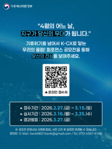 기후에너지환경부에서 2026년 K-GX 국제주간•기후변화주간 사전홍보 및 단소중립 실천에 대한 미래세대의 관심 유도를 위해 ‘2026년 K-GX 국제주간•기후변화주간 대학생 퍼포먼스 공모전’을 추진합니다. 관심있는 학생은 아래 내용과 붙임 파일을 참고해 참여해보시길 바랍니다.