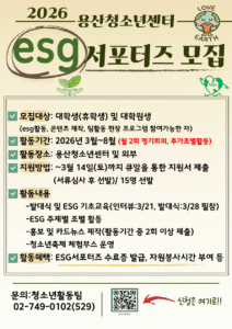용산청소년센터에서 ‘2026년 ESG 서포터즈’를 모집하고 있으니 관심있는 학생은 아래 내용을 참고해주시길 바랍니다.