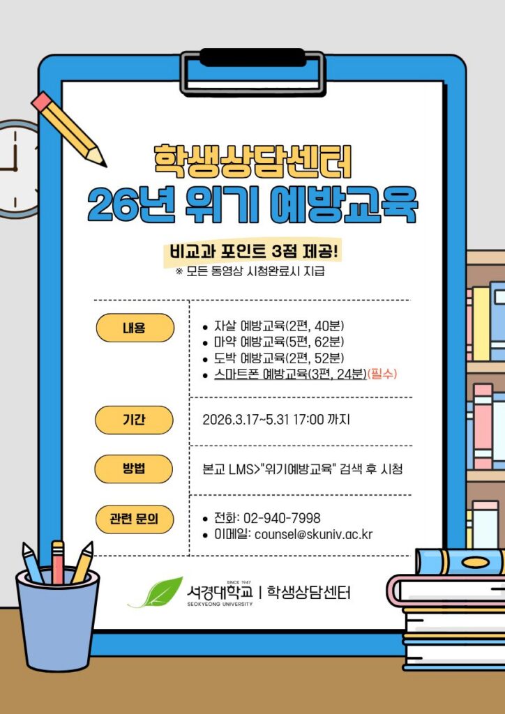 사전에 인식하고 예방할 수 있도록 도움을 주기 위하여 다음과 같이 2026년 위기 예방교육을 진행하고 있습니다.