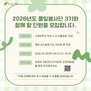 서경대학교 풀잎봉사단에서는 2026학년도 풀잎봉사단 3기와 함께할 단원을 모집합니다.