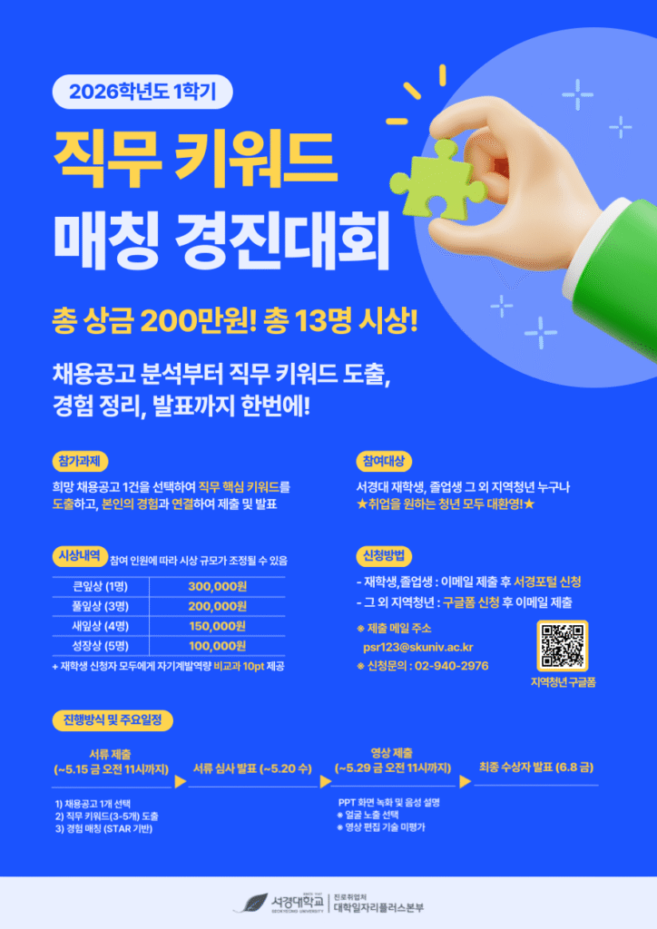 서경대학교 진로취업처 대학일자리플러스본부에서는 서경대학교 재학생 및 졸업생, 지역청년을 대상으로 채용공고 기반 직무 이해 능력 향상과 개인 경험의 직무 적합성 연결 역량 강화를 위한 「2026학년도 1학기 직무 키워드 매칭 경진대회」를 개최하오니 관심 있는 분들의 많은 참여 바랍니다. 본 경진대회는 채용공고 분석부터 직무 키워드 도출, 경험 정리, 발표까지 실제 취업 준비 흐름을 단계적으로 경험할 수 있도록 운영됩니다.
