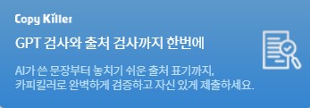 우리 대학은 학문적 윤리 확립과 공정한 학습 환경 조성을 위하여 표절 검사 시스템 카피킬러 및 AI 작성물 판별 시스템 GPT 킬러를 도입하여 운영합니다.