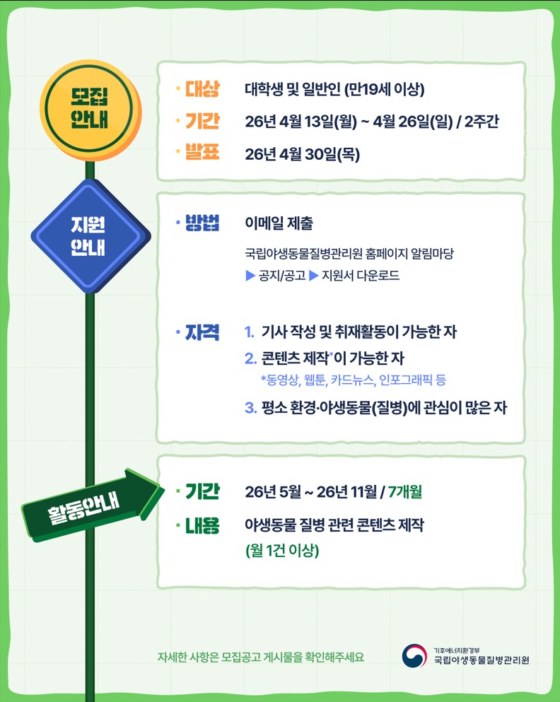 국립야생동물질병관리원에서는 야생동물질병과 관련된 주요 정책과 소식들을 국민들에게 국민들에게 쉽고 참신한 콘텐츠로 제작해 널리 알리고자 ‘SNS 기자단’을 모집합니다.