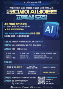 공지사항 전체공지 일반공지 학사공지 FYP공지 장학공지 진로취업공지 행사안내 대외활동 등록·납부 채용공지 서경 TODAY 서경 TODAY FAQ 전체 FAQ 일반 FAQ 교무학적 FAQ 장학 FAQ IT FAQ 자료실 전체 자료실 일반 자료실 교무학적 자료실 장학 자료실 IT 자료실 개인정보공지 전체 개인정보공지 개인정보보호공지 개인정보위수탁업체공지 개인정보제공내역공지 2026코디세이 AI 네이티브 교육생 모집 작성자장학과 등록일2026-04-17 조회수20 첨부파일 코디세이 AI 네이티브 교육생 모집 공고문.pdf(새 창 열림) 코디세이 AI 네이티브 교육생 모집글 한글 파일.hwp(새 창 열림) 목록