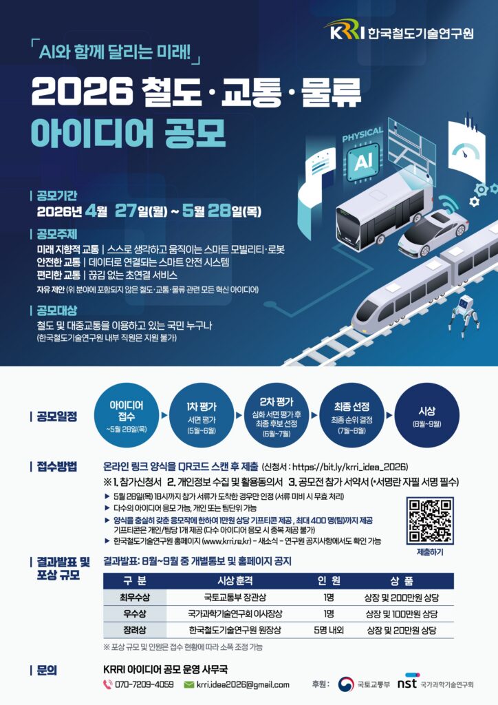 한국철도기술연구원에서 철도, 교통, 물류 분야의 국민 불편사항을 해소하고 안전하고 편리한 사회구현을 위하여 국민으로부터 아이디어를 제안받고 이에 필요한 기술을 개발하고자 ‘2026 철도 교통 물류 대국민 아이디어 공모’를 시행하고 있습니다.