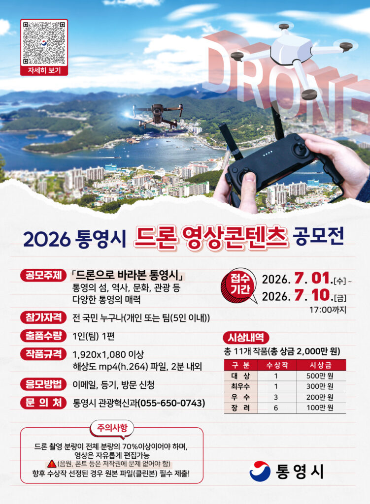경상남도 통영시에서 “드론으로 바라본 통영시”를 주제로 「2026 통영시 드론 영상콘텐츠 공모전」을 개최합니다. 학생분들의 많은 관심 부탁드립니다.