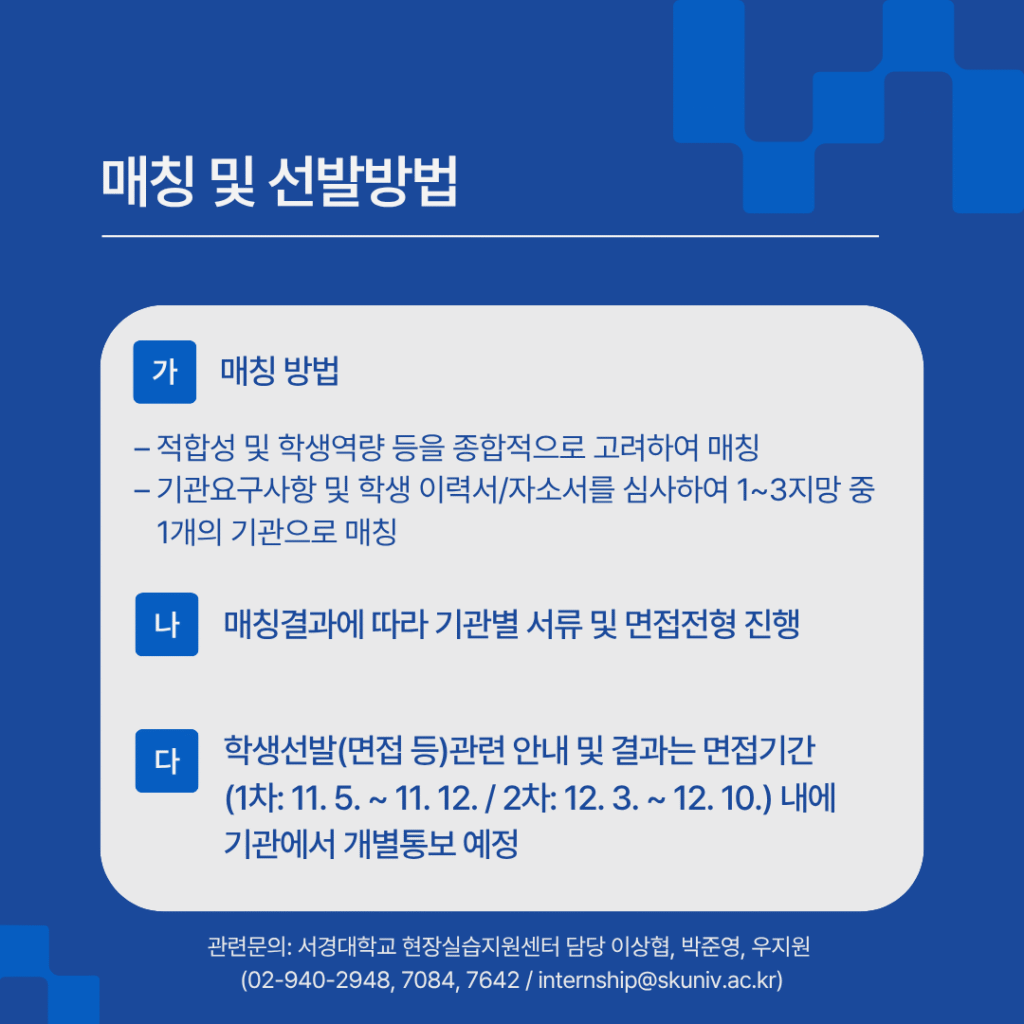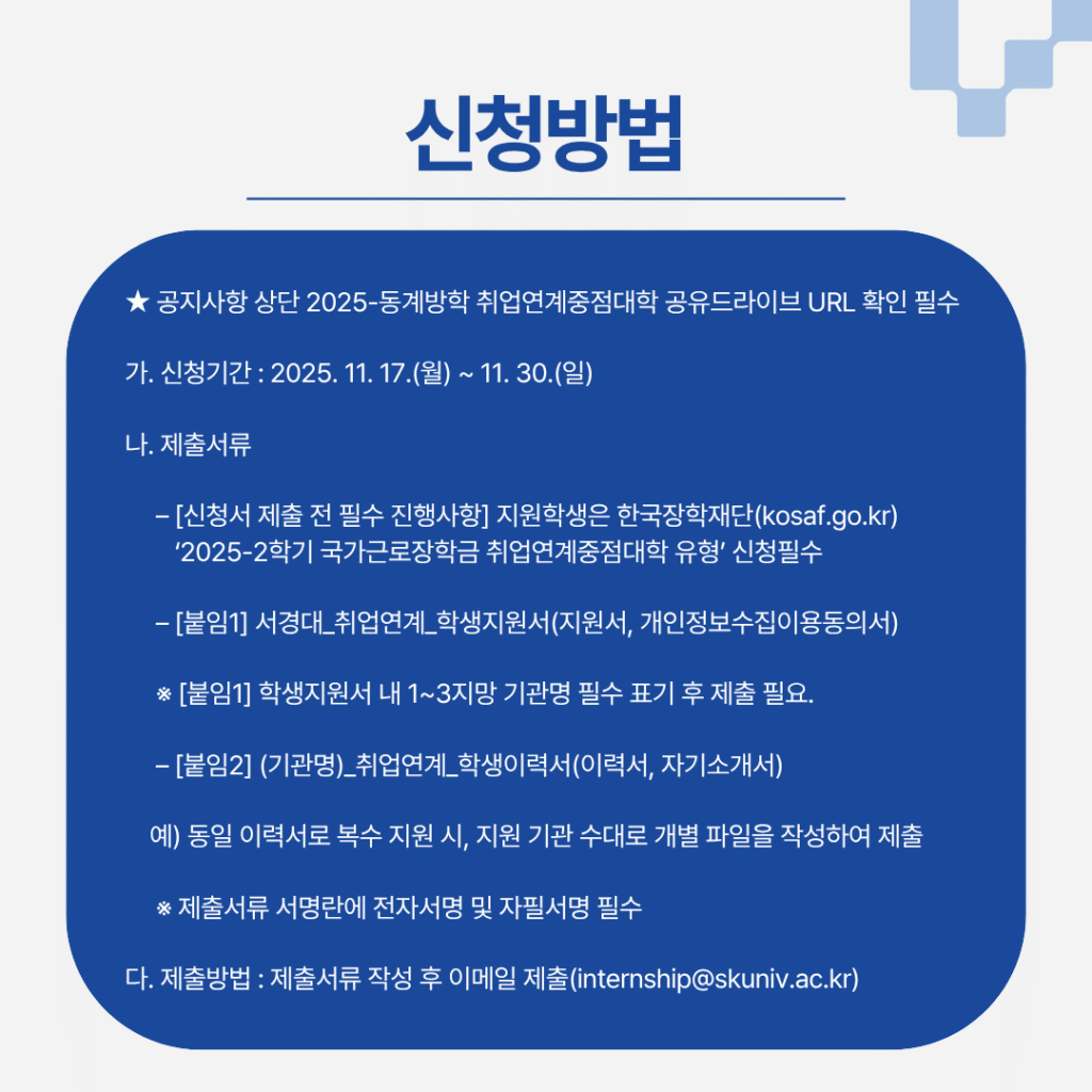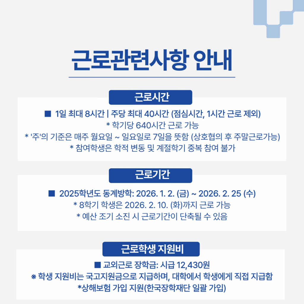 공지사항 전체공지 일반공지 학사공지 장학공지 진로취업공지 행사안내 대외활동 등록·납부 채용공지 서경 TODAY 서경 TODAY FAQ 전체 FAQ 일반 FAQ 교무학적 FAQ 장학 FAQ IT FAQ 자료실 전체 자료실 일반 자료실 교무학적 자료실 장학 자료실 IT 자료실 개인정보공지 전체 개인정보공지 개인정보보호공지 개인정보위수탁업체공지 개인정보제공내역공지 [서경대 카드뉴스] 2025학년도 동계방학 취업연계중점대학 근로학생 2차 모집안내 작성자홍보실 등록일2025-11-19 조회수21 <홍보실=장유빈 학생기자> 목록