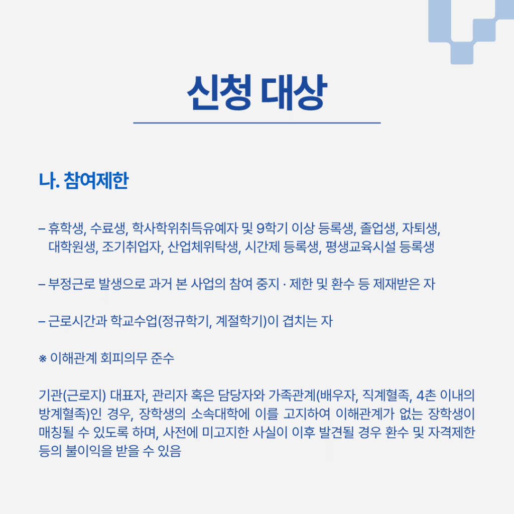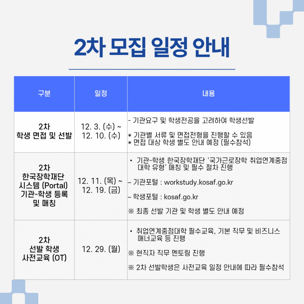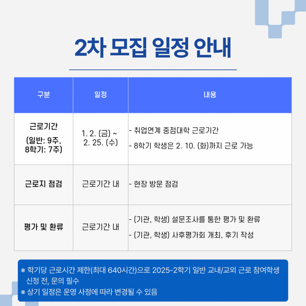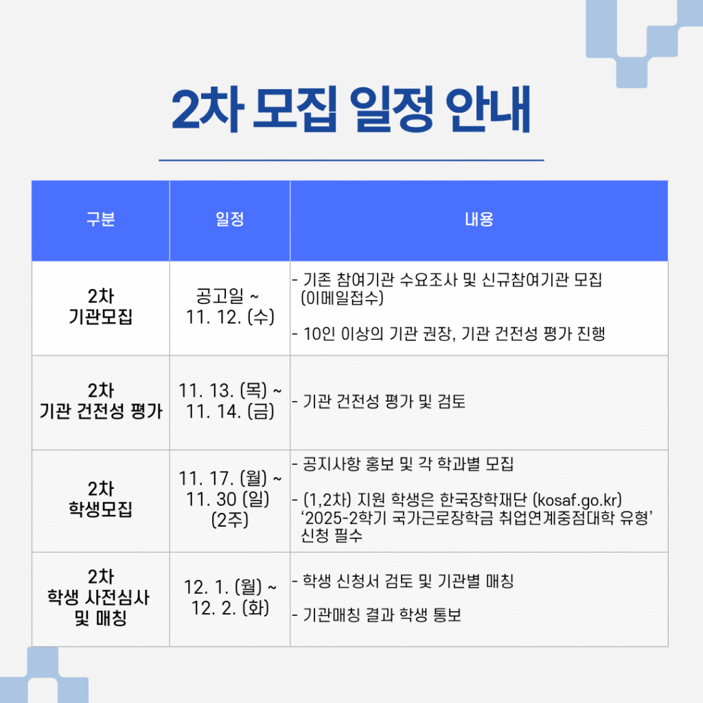 공지사항 전체공지 일반공지 학사공지 장학공지 진로취업공지 행사안내 대외활동 등록·납부 채용공지 서경 TODAY 서경 TODAY FAQ 전체 FAQ 일반 FAQ 교무학적 FAQ 장학 FAQ IT FAQ 자료실 전체 자료실 일반 자료실 교무학적 자료실 장학 자료실 IT 자료실 개인정보공지 전체 개인정보공지 개인정보보호공지 개인정보위수탁업체공지 개인정보제공내역공지 [서경대 카드뉴스] 2025학년도 동계방학 취업연계중점대학 근로학생 2차 모집안내 작성자홍보실 등록일2025-11-19 조회수21 <홍보실=장유빈 학생기자> 목록