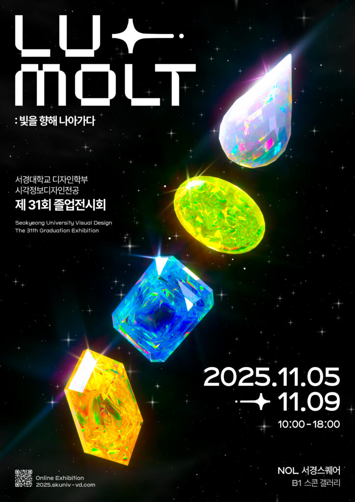 이번 디자인학부 시각정보디자인전공 졸업작품전시회는 “LUMOLT: 빛을 향해 나아가다”라는 주제로 기획됐다. LUMOLT는 라틴어의 ‘빛’을 의미하는 Lux와 ‘탈피’를 뜻하는 Molt를 결합한 것으로, 각자의 경험과 선택을 디딤돌로 삼아 변화되고 발전된 모습으로 새롭게 앞으로 나아간다는 메시지를 담고 있다.