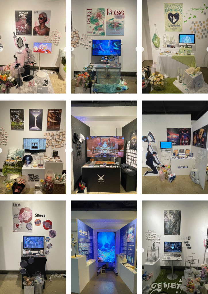 RIZZN(고나영): 생명력을 지닌 금속을 신체에 직접 착용함으로써, 인간과 기계가 소통하는 새로운 감각을 연결하는 미디어 브랜드, Poise(곽지우): 디지털 환경 속에서 과도한 정보와 자극으로부터 잃어버린 감각의 균형을 다시 찾는 과정을 그린 미디어, Pygmalion(김아현): 그리움에서 탄생한 조각이 스스로의 존재를 깨닫고 완전한 인간으로 거듭나는 변용의 서사를 담은 미디어 스토리. 담온:DAMon(박민영): SNS 속 비교와 경쟁에 지친 현대인들을 위한 힐링·치유 공간을 시각화한 미디어아트 브랜드, NEXUS(박재형): 1인칭 시점에서 안내로봇 ‘NEXO’와 함께 과거 이집트와 그리스, 그리고 조선의 문명이 미래적 기술과 융합된 새로운 세계를 탐험하는 몰입형 미디어 아트 콘텐츠, SCAN(용수지): 완벽한 하루가 무너지는 균열 속에서 두 인물이 교란과 관찰의 진실에 맞서는 SF 생존 스릴러 웹툰, Sileak(유승현): 소리 3D아이콘으로 평등하고 차별 없는 소리를 연결하는 새로운 소리 시각화 미디어아트, 시나브로:SEANABRO(윤도현): 우리가 인식하지 못하는 사이에 진행되는 이 변화를 시각적으로 경험하게 함으로써, 산호초의 붕괴가 단순한 생태계 문제를 넘어 결국 인간의 삶과 연결된 중요한 문제임을 전달하는 프로젝트, GENETii(이유경): 자연과 기계가 서로를 모방해 경계를 허무는 순간 새로운 생명의 가능성을 시각화하는 인공과 자연의 융합을 탐구한 3D 미디어아트 등 신박한 학생들의 작품을 선보였다.