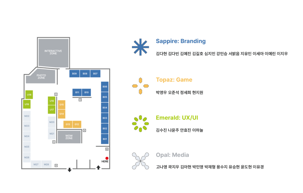 이를 바탕으로 전시를 브랜드, 게임, UXUI, 미디어 등 4개 카테고리를 구성하고, 각 카테고리를 사파이어, 토파즈, 에메랄드, 오팔 등과 조응시켜 보석의 성질을 그래픽 요소에 반영해 디벨롭했습니다.