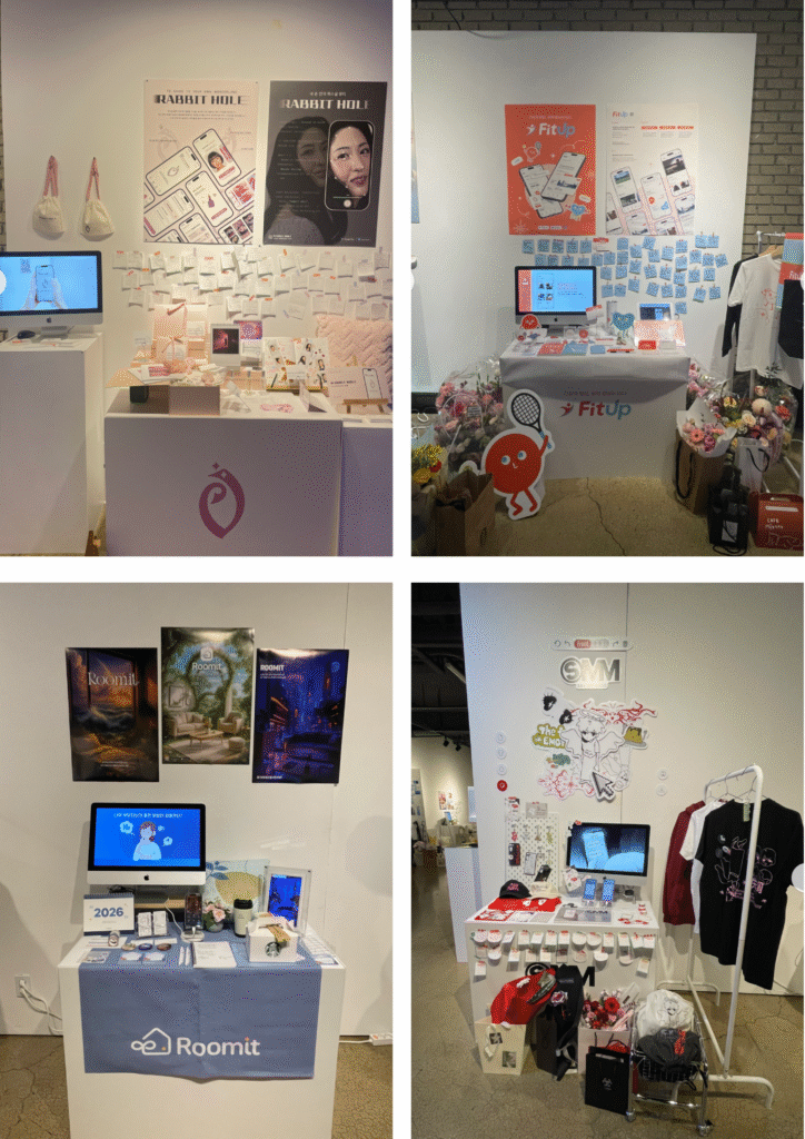 래빗홀(김수진): 얼굴과 피부, 퍼스널 컬러를 분석해 맞춤형 뷰티 스타일링을 제안하는 서비스, FitUp(나윤주): 중장년층을 중심으로 다양한 세대가 생활체육을 쉽고 즐겁게 사용할 수 있도록 돕는 모바일 서비스, Roomit(안효진): AI 분석을 바탕으로 개인의 취향과 생활 패턴에 맞춘 인테리어 추천과 AR 미디어 아트를 통해 환상적인 연출을 더하여 나만의 특별한 공간을 완성할 수 있도록 돕는 서비스, SMM:Say MY Mess(이하늘): 나만의 취향을 더욱 확고히 하며 남들과 다른 단 하나뿐인 옷을 만들 수 있는 주문형 패션 브랜드서비스 등 참신하고 다채로운 학생들의 작품이 진열됐다.