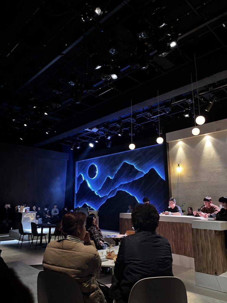 ’레스토랑 산‘은 이머시브 씨어터 프로젝트의 일환으로 만들어진 공연입니다. 프리 프로덕션 단계였던 8월 초에 완성된 대본을 바탕으로 개강 후 연습을 시작하여 교수님, 배우, 스탭들과 함께 다양한 관객 참여 요소를 구축해 나갔습니다. 9월 한 달간은 모두 이머시브 공연이 가진 특성을 이해하는데 힘썼던 것 같아요. 배우들이 텍스트에 너무 얽매이지 않도록 리딩과 분석 기간을 줄이는 대신, 주어진 상황에 즉흥적으로 대응하는 에쮸드 훈련을 했습니다. 무대 디자인이 픽스난 뒤에는 관객이 사방 어느 곳이든 존재할 수 있다는 가능성을 상정하며 동선을 그었고요. 추석 연휴가 끝나고 학교 제작소에서 다같이 무대 작화에 참여하기도 하며, 총 6번의 런스루(장면을 처음부터 끝까지 끊지 않고 진행하는 방식)를 통해 보완할 점을 파악했어요. 극장 셋업 이후 나흘 간의 테크니컬 리허설을 거쳐 총 세 번의 오픈 리허설을 진행했고, 이를 통해 학부생 관객의 반응을 확인하고 본 공연에 들어갈 수 있었습니다.