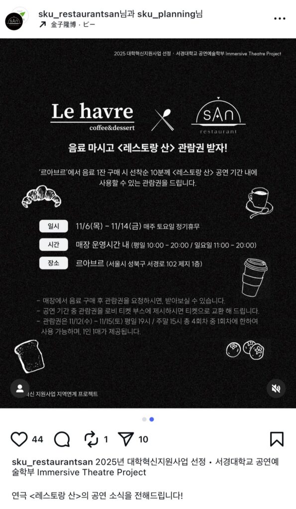 홍보 마케팅 또한 적극적으로 이뤄졌다. 공연팀은 카페 ‘르아브르’와의 콜라보 이벤트를 진행해 음료 1잔 구매 시 선착순 10명에게 공연 관람권을 증정했다. 이벤트는 11월 6일(금)부터 14일(금)까지 2주간 진행되었으며, 음료뿐만 아니라 다양한 디저트 메뉴와 연계해 관람객들의 참여를 이끌어냈다.