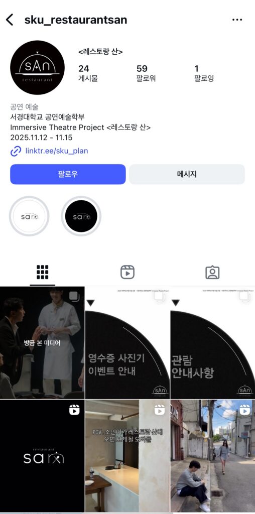 서경대학교 2025년 대학혁신지원사업 선정 서경대학교 공연예술학부 Immersive Theatre Project 연극 ‘레스토랑 산’이 11월 12일(수)부터 15일(토)까지 4일간 평일 오후 7시, 주말 오후 3시 서경대학교 북악관 8층 북악홀에서 성황리에 개최됐다.