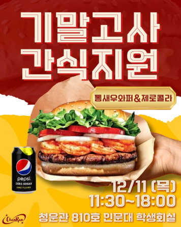 제35대 찬란 인문과학대는 학우들의 시험 준비를 북돋워 주기 위해, ‘통새우와퍼와 제로콜라’를 제공한다. 수령 기간은 12월 11일(목) 낮 11시 30분부터 오후 6시까지 청운관 810호 인문대 학생회실에서 학생회비 납부자에 한해 진행되며, 준비한 간식이 모두 소진될 경우 조기 종료 될 수 있다.