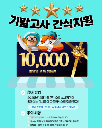 제34대 백야무적이공대에서는 추운 겨울, 마지막 기말고사를 준비하며 열심히 공부하고 있는 이공대 재학생들을 위해 ‘배달의민족 1만원 상품권’을 선착순 40명에게 제공한다. 행사는 12월 11일(목) 오후 6시 백야무적이공대 공식 인스타그램(@sku_34th_endlesslight)에 업로드될 게시물에 ‘학과 / 학번 / 이름 / 시험기간 멘트 한마디’에 댓글을 달면 된다. 단, 이공대 학생회비 납부자에 한해 진행된다.
