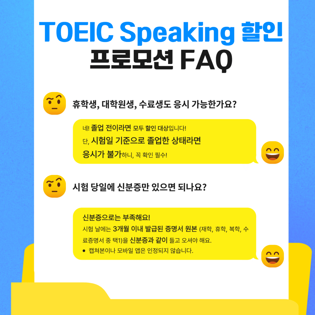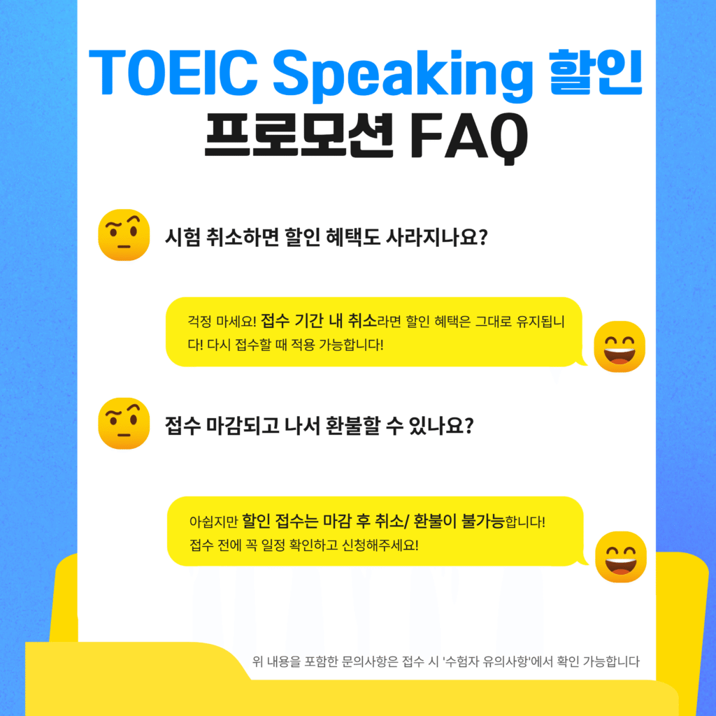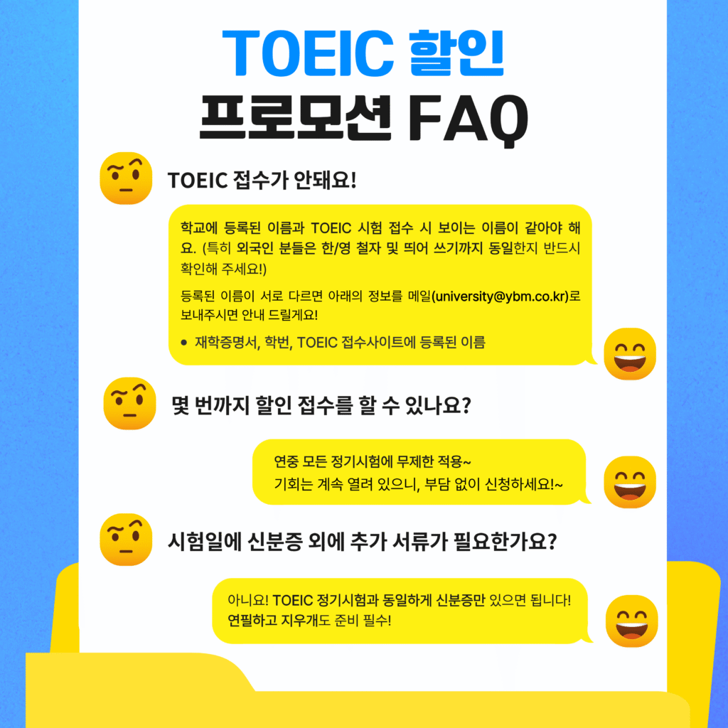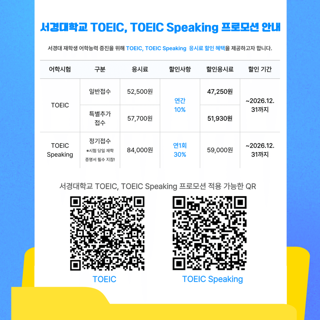 공지사항 전체공지 일반공지 학사공지 FYP공지 장학공지 진로취업공지 행사안내 대외활동 등록·납부 채용공지 서경 TODAY 서경 TODAY FAQ 전체 FAQ 일반 FAQ 교무학적 FAQ 장학 FAQ IT FAQ 자료실 전체 자료실 일반 자료실 교무학적 자료실 장학 자료실 IT 자료실 개인정보공지 전체 개인정보공지 개인정보보호공지 개인정보위수탁업체공지 개인정보제공내역공지 [서경대 카드뉴스]서경대학교 TOEIC, TOEIC Speaking 프로모션 URL 안내 작성자홍보실 등록일2025-12-11 조회수322 <홍보실=임다현 학생기자> 목록