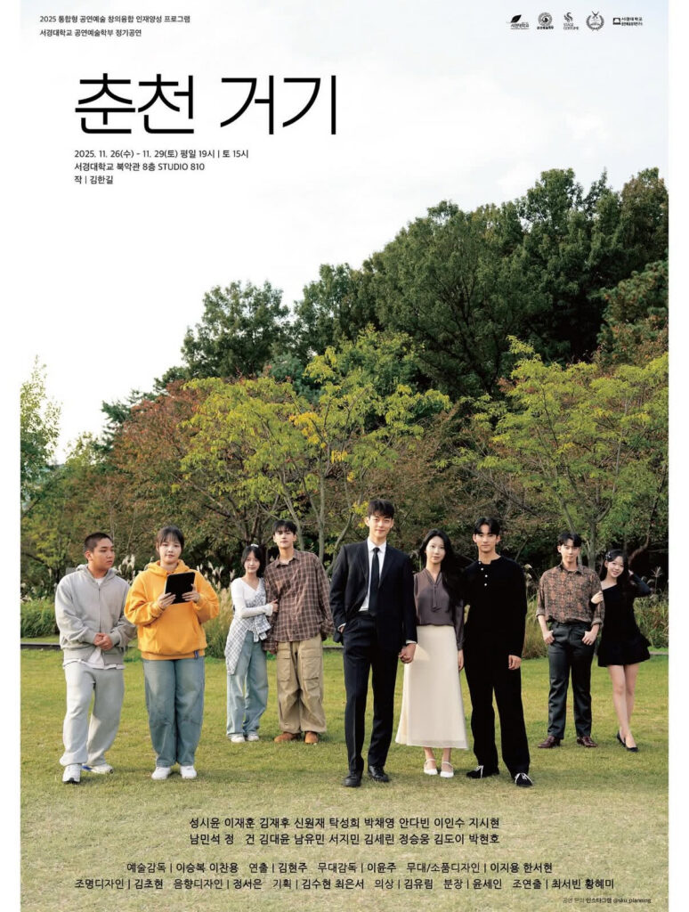 서경대학교 공연예술학부 2025학년도 통합형 창의융합 인재양성 프로그램 여섯 번째 정기공연 연극 ‘춘천 거기’가 11월 26일 (수)부터 29일 (토)까지 사흘 간 평일 오후 7시, 주말 오후 3시에 서경대학교 북악관 스튜디오 810에서 성황리에 개최됐다.