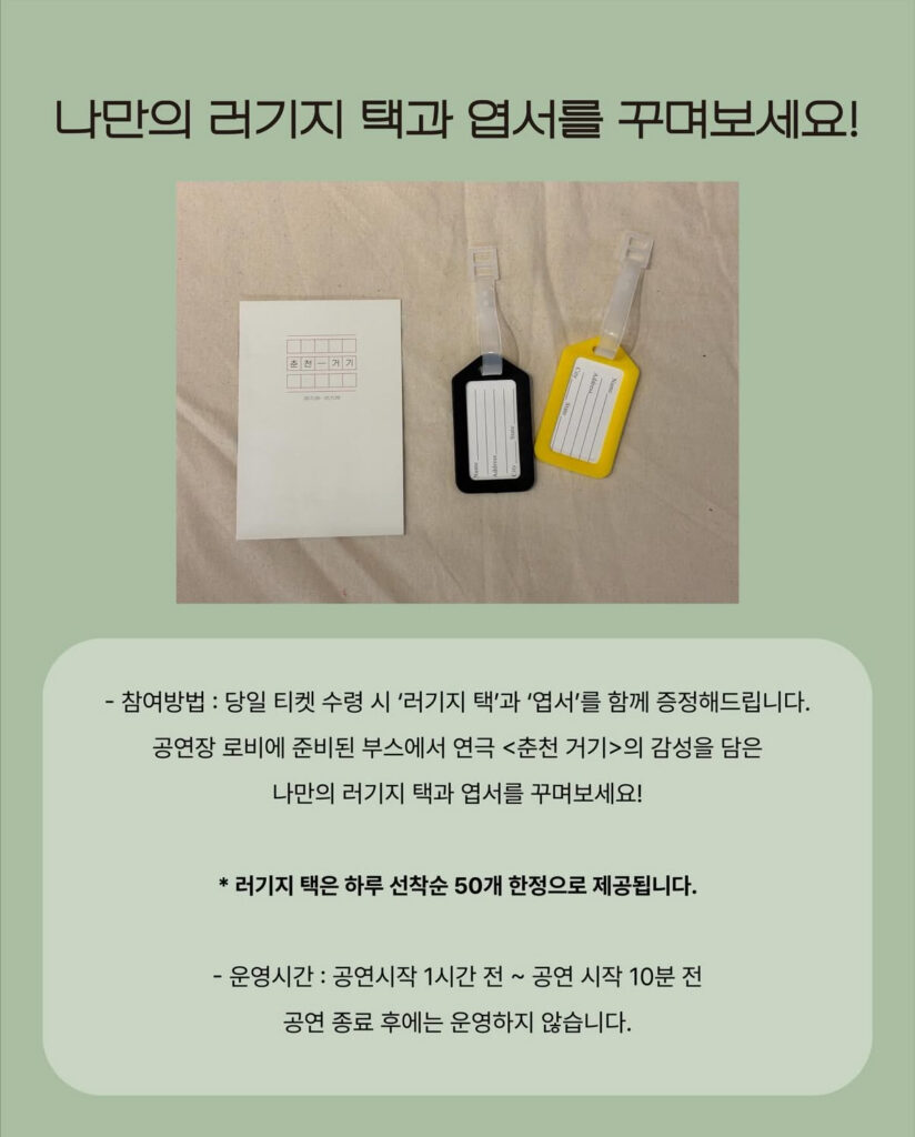 이번 연극 ‘춘천 거기’는 당일 티켓 수령 시 선착순 50명에게 ‘러기지 택’과 ‘엽서’를 증정해 ‘춘천 거기’의 감성을 담은 나만의 특별한 추억을 꾸미고 간직할 수 있는 기회도 됐다.
