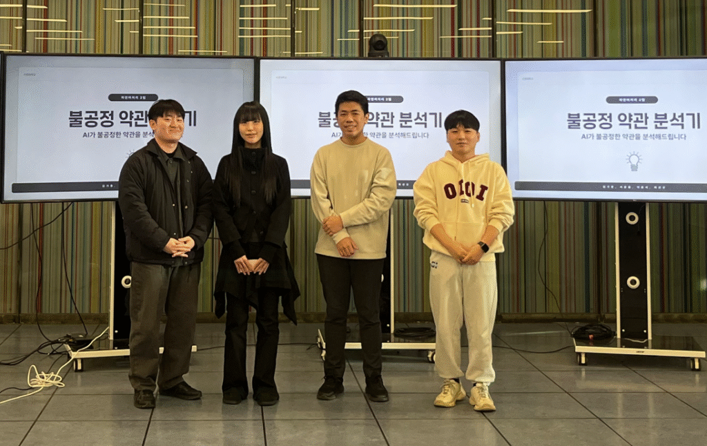 금상은 ‘LLM 기반 불공정 약관 분석기’ 팀이 수상했으며, 최선규·이윤서(소프트웨어학과 4학년, 서경SW아카데미 4기), 김기중(소프트웨어학과 4학년, 서경SW아카데미 2기), 서준용(소프트웨어학과 3학년) 학생이 참여했다.