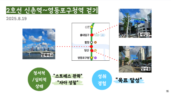 제가 최근에 서울 산책을 하면서 가장 기억에 남았던 경험을 발표에서 소개했습니다. 바로 [2호선 신촌역->영등포구청역까지 따라 걷기]입니다. 발표에서 이 산책이 어떤 계기로 시작되었고, 어떻게 산책을 진행했으며, 제가 느낀 감정과 깨달음을 자기효능감의 4가지 요인과 유기적으로 결합하여 설명했습니다. 이때 적절한 때의 제스처와 말의 속도 등이 청중들에게 제 발표를 잘 전달하는 데 도움이 되었다고 생각합니다.