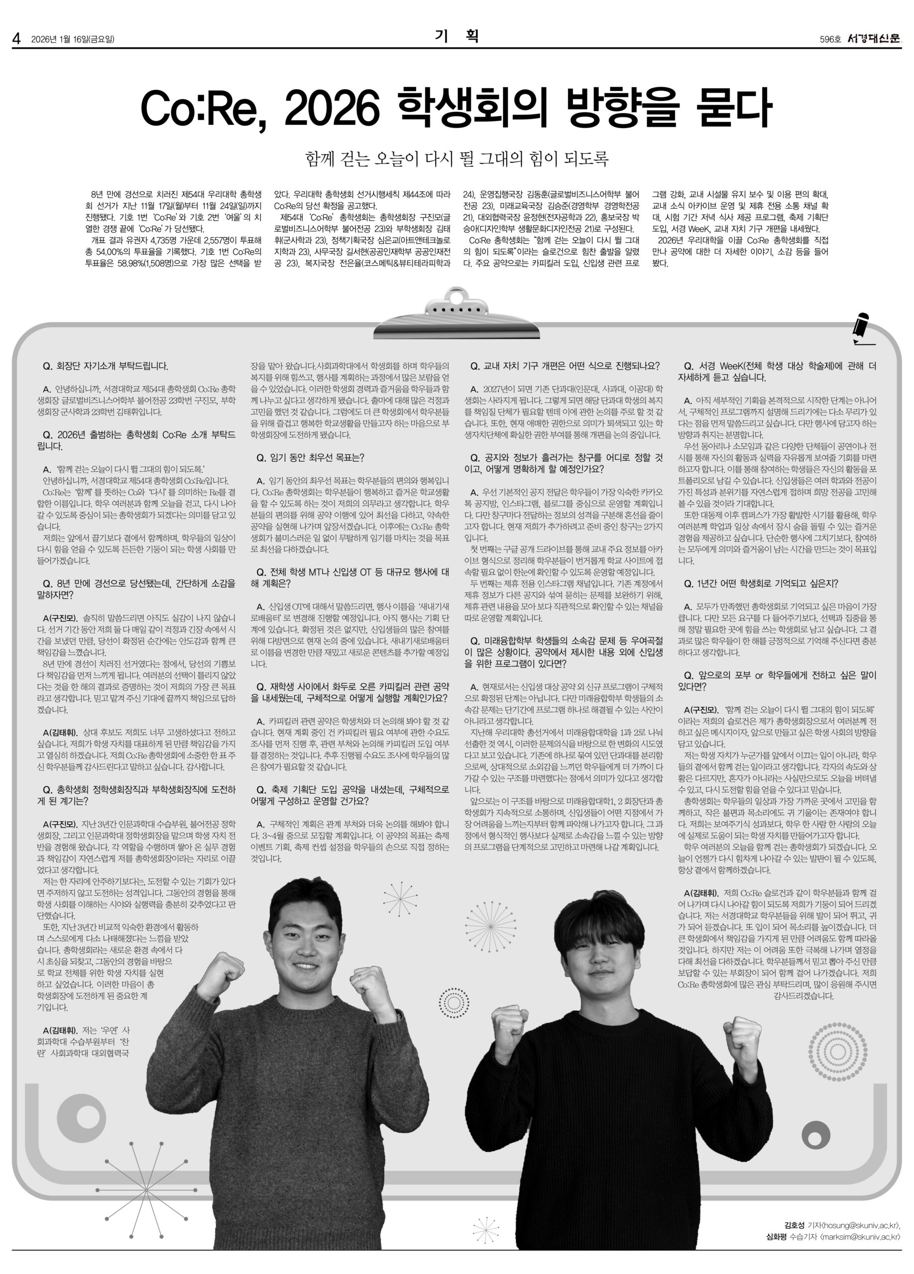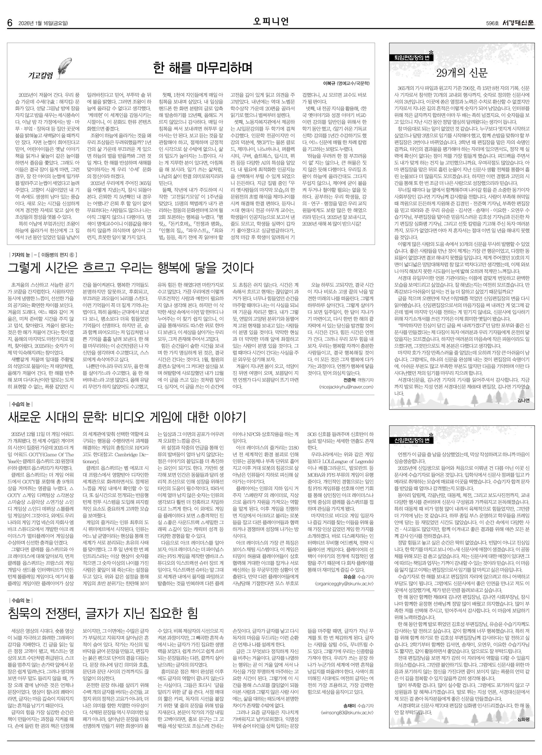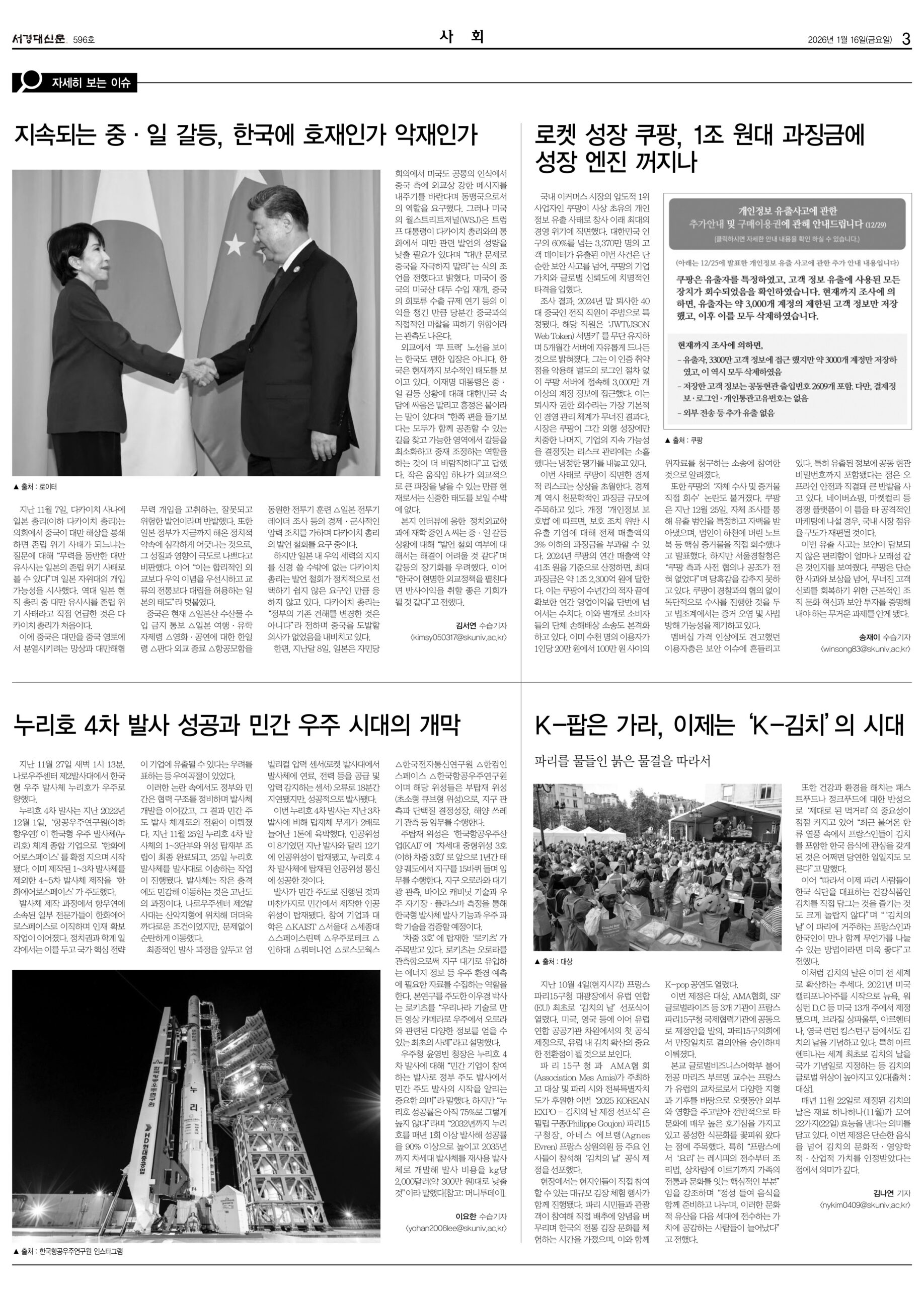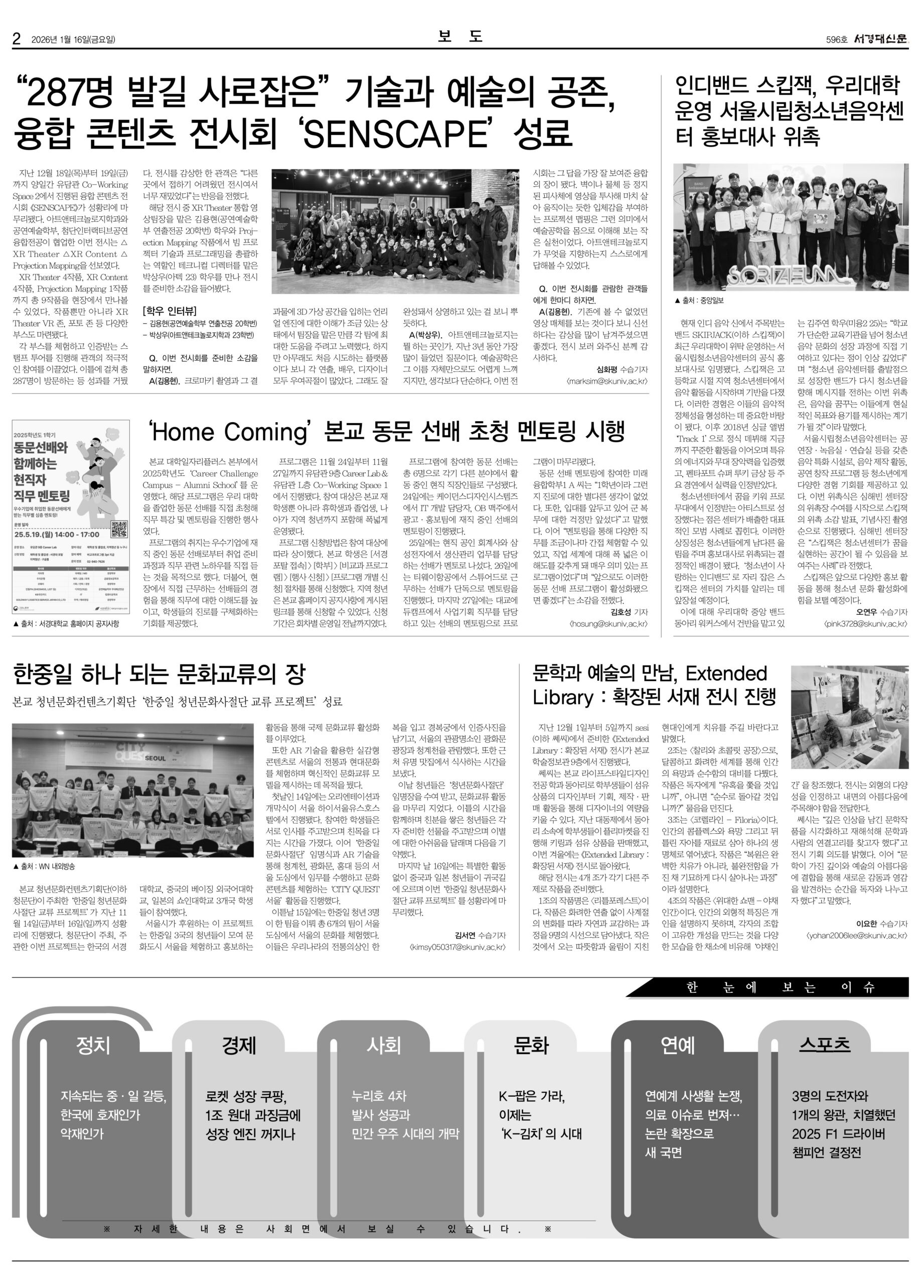 공지사항 전체공지 일반공지 학사공지 FYP공지 장학공지 진로취업공지 행사안내 대외활동 등록·납부 채용공지 서경 TODAY 서경 TODAY FAQ 전체 FAQ 일반 FAQ 교무학적 FAQ 장학 FAQ IT FAQ 자료실 전체 자료실 일반 자료실 교무학적 자료실 장학 자료실 IT 자료실 개인정보공지 전체 개인정보공지 개인정보보호공지 개인정보위수탁업체공지 개인정보제공내역공지 서경대신문 596호 작성자서경신문사 등록일2026-01-16 조회수53 첨부파일 서경대신문 596호 1면.jpg 서경대신문 596호 2면.jpg 서경대신문 596호 3면.jpg 서경대신문 596호 4면.jpg 서경대신문 596호 5면.jpg 서경대신문 596호 6면.jpg 서경대신문 596호 7면.jpg 서경대신문 596호.PDF 목록