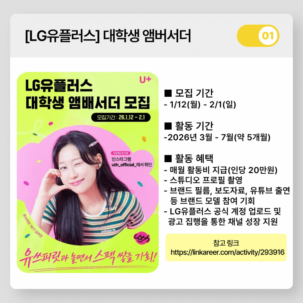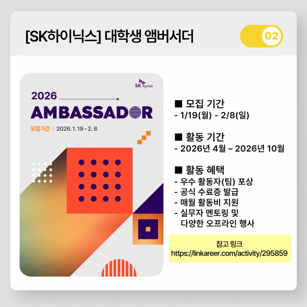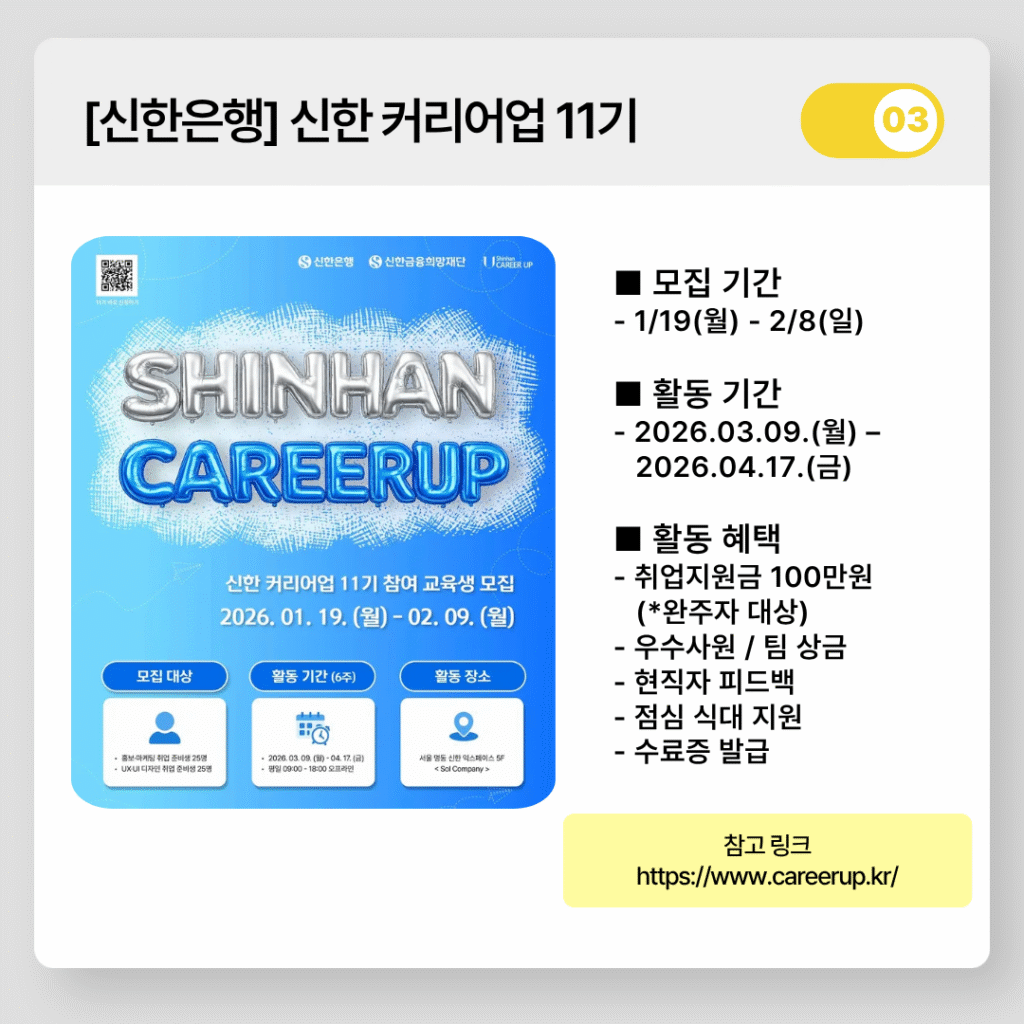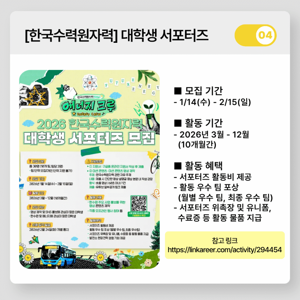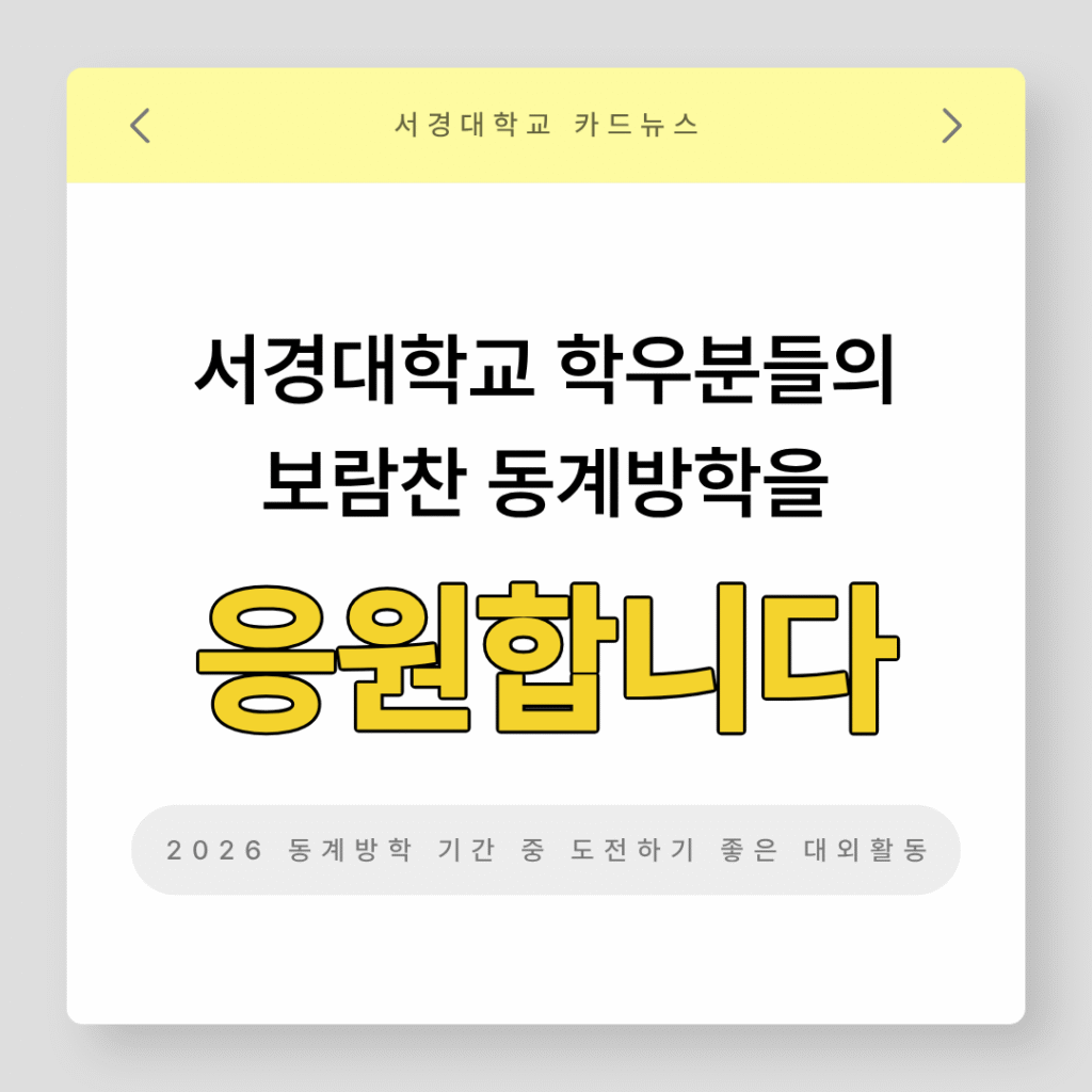 공지사항 전체공지 일반공지 학사공지 FYP공지 장학공지 진로취업공지 행사안내 대외활동 등록·납부 채용공지 서경 TODAY 서경 TODAY FAQ 전체 FAQ 일반 FAQ 교무학적 FAQ 장학 FAQ IT FAQ 자료실 전체 자료실 일반 자료실 교무학적 자료실 장학 자료실 IT 자료실 개인정보공지 전체 개인정보공지 개인정보보호공지 개인정보위수탁업체공지 개인정보제공내역공지 [서경대 카드뉴스] 2026 동계방학 기간 중 도전하기 좋은 대외활동 작성자홍보실 등록일2026-01-21 조회수114 <홍보실=최가은 학생기자> 목록