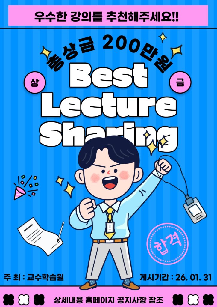이번 공모전은 한 해 동안 수강한 강의 중 가장 인상 깊었던 수업을 돌아보고, 교수와 학생이 함께 만들어가는 배움의 가치를 공유하기 위해 마련됐다. 2025년 12월 22일부터 2026년 1월 16일까지 접수가 진행됐으며, 1월 19일부터 23일까지 심사를 거쳐 1월 26일 이후 최종 결과가 발표됐다.