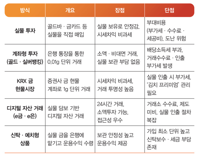 투자 방법도 구분해서 이해할 필요가 있다. 금 투자는 크게 세 가지다. 첫째는 실물 금이다. 눈에 보이고 손에 잡힌다는 장점이 있지만 보관과 거래비용이 부담이다.