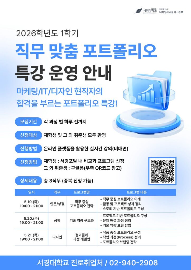 마케팅·IT·디자인 분야 현직자가 참여하는 ‘합격을 부르는 포트폴리오 특강’이 진행된다. 재학생은 물론 취업을 준비 중인 누구나 참여할 수 있으며, 직무별 포트폴리오 완성도를 높이고 싶은 이들에게 열려 있다.