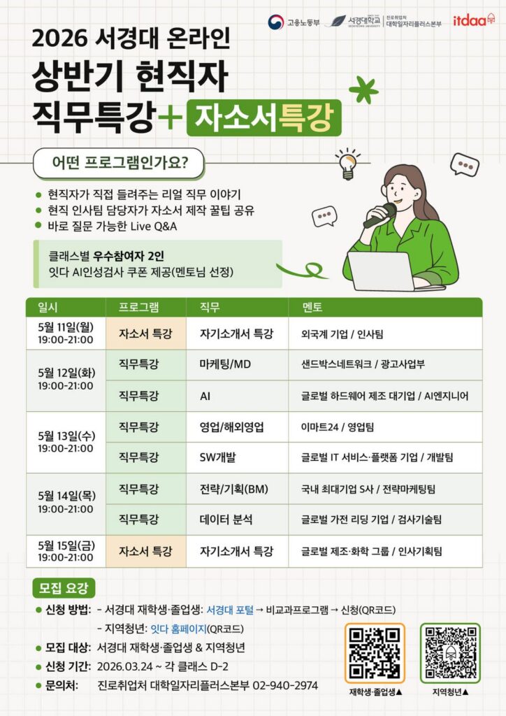 신청은 3월 24일부터 각 클래스 시작 2일 전까지 서경포탈을 통해 가능하며, 중복 신청도 허용된다. 자소서 특강은 5월 11일과 5월 15일, 직무특강은 5월 12일, 13일, 14일에 각각 진행되며, 모든 프로그램은 오후 7시부터 9시까지 운영된다. 직무특강은 마케팅·MD, AI, 영업·해외영업, SW개발, 전략·기획(BM), 데이터분석 등 다양한 분야 중 원하는 직무를 선택해 참여할 수 있다.