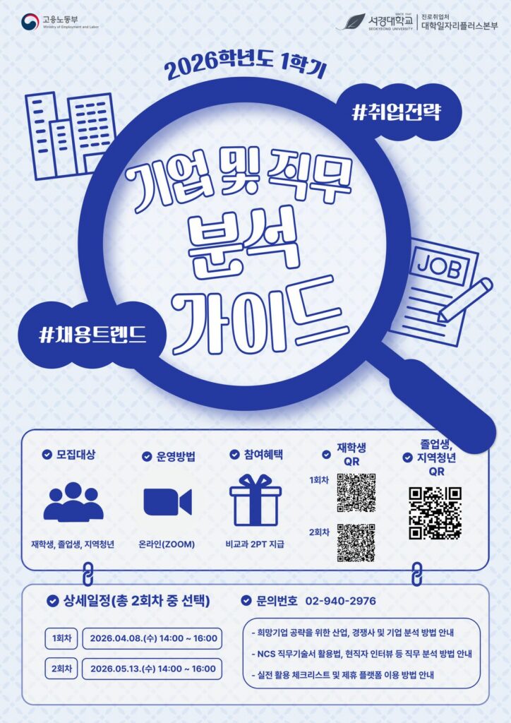 취업전략과 채용 트렌드를 이해할 수 있는 온라인 특강이 진행된다. 기업 분석과 직무 분석 방법을 배우고 싶은 학생이나, 보다 전략적인 취업 준비 과정을 알고 싶은 경우 누구나 신청할 수 있으며, 서경대학교 재학생과 지역 청년 모두 참여 가능하다.